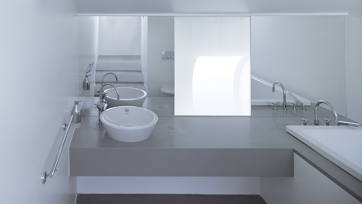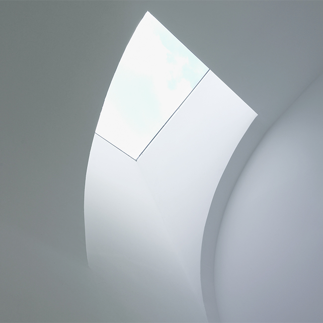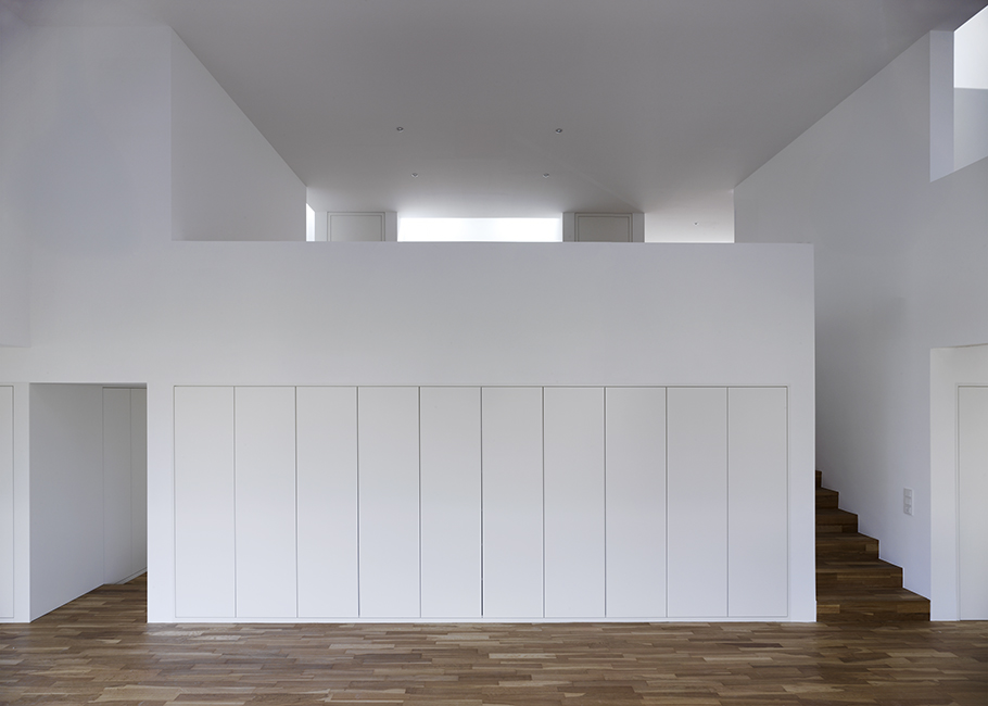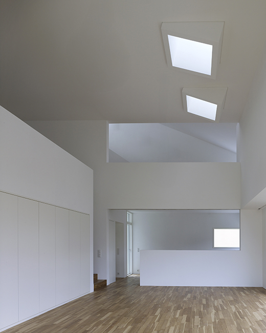 Die inverse Situation des Grundstücks - Erschließung im Süden, Garten im Norden - bildet den Ausgangspunkt der Entwurfsüberlegungen. Ziel ist es, das sich gegenseitig ausschließende Gegenüber von guter Orientierung und guter Belichtung in eine simultane Präsenz der beiden Qualitäten zu überführen. Zwei gefaltete Betonbänder, die primären strukturellen und raumbildenden Elemente des Gebäudes, werden ineinander verschränkt. Eine Rotationsbewegung entstehet, die durch die innere Wegeführung, eine Vielzahl von Raumbezügen und die Dachform aufgegriffen und verstärkt wird.